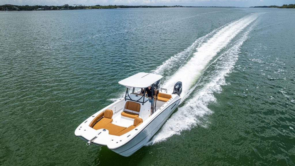 The precise engineering of the hull creates a mixture of water and air under the deck that makes the boat feel as if it’s riding on a cloud. This phenomenon also provides increased fuel economy, so you’re unlikely to need the entire 98-gallon fuel capacity.
