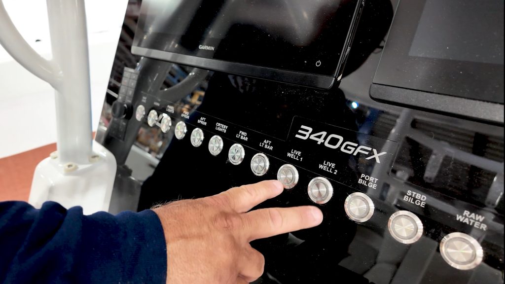On the 340 GFX, the system uses two 2500-gallon-per-hour pumps. These pumps supply water to the livewells and allow the operator to adjust flow depending on bait type and conditions.