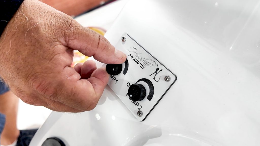 - A flow control meter at the helm that adjusts how much water moves into the livewells